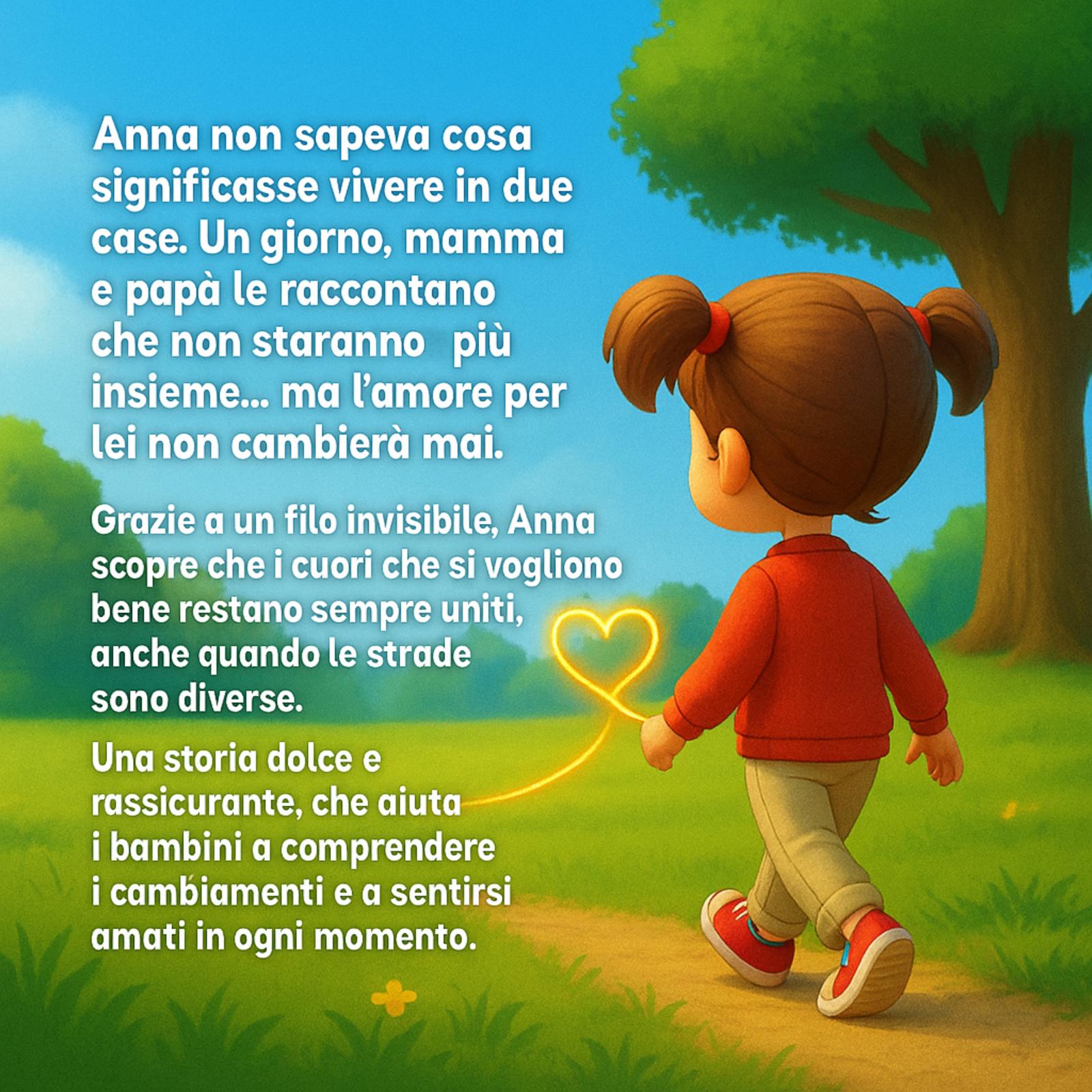 Anna e il filo invisibile è un libro illustrato per bambini che affronta con delicatezza il tema della separazione dei genitori, trasmettendo un messaggio rassicurante di amore incondizionato, unione familiare e resilienza emotiva. Una storia dolce e positiva che aiuta i piccoli lettori a capire che, anche quando mamma e papà vivono in case diverse, il loro amore resta sempre vicino al cuore.