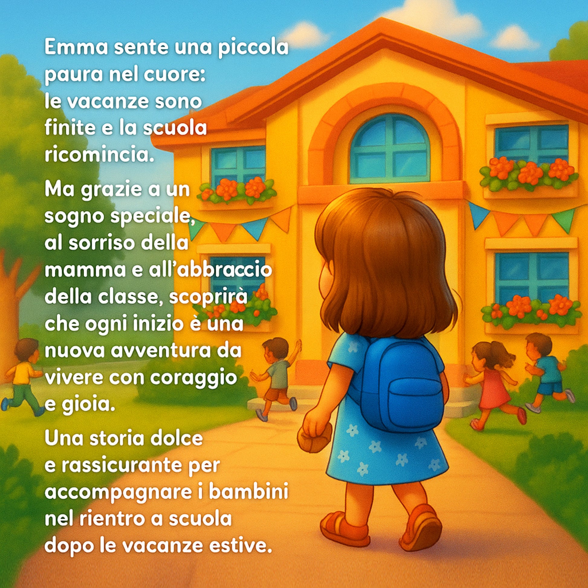 Pensato per bambini dai 2 ai 6 anni, questo racconto accompagna i piccoli lettori in un momento delicato: il passaggio tra vacanze e scuola. Con l’aiuto di Emma, scopriranno che ogni nuovo inizio può trasformarsi in una grande avventura fatta di amicizia, sorrisi e scoperte.