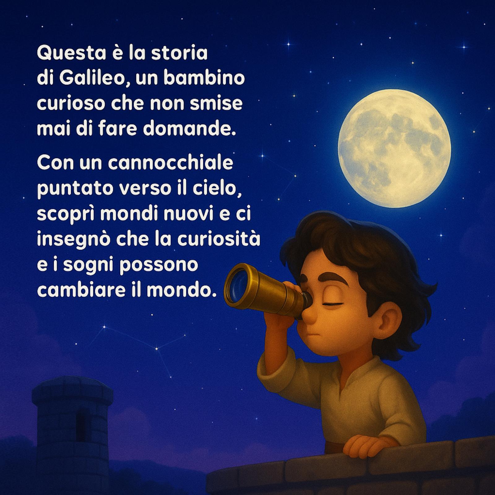 Libro illustrato per bambini 2–6 anni che racconta la vita di Galileo Galilei in forma di favola moderna, perfetta per avvicinare i più piccoli a scienza, astronomia e curiosità. Con illustrazioni in cartoon 3D dai colori vivi e un linguaggio semplice e coinvolgente, i bambini scopriranno come un uomo con un cannocchiale cambiò per sempre il modo di guardare il cielo.