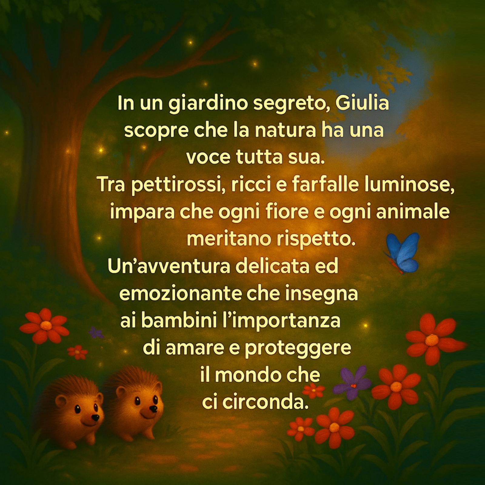 Giulia trova un cancello nascosto tra i cespugli e scopre un giardino segreto pieno di meraviglia: alberi che sussurrano, ruscelli che cantano, lucciole luminose e un pettirosso che la guida. Qui impara che chi ama e rispetta la natura viene accolto in un rifugio speciale dove regnano amicizia, empatia e magia.