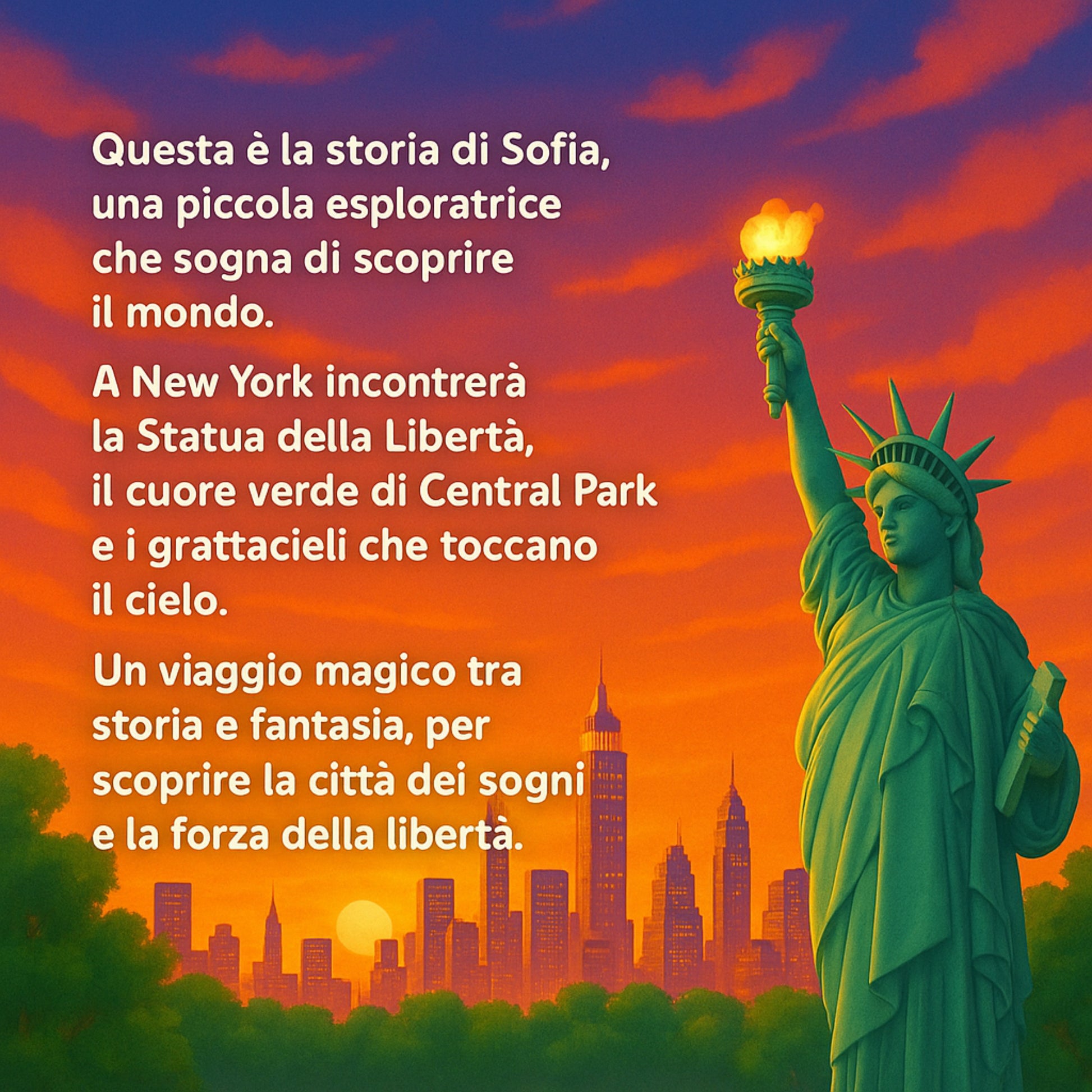 Pensato per bambini dai 2 ai 6 anni, questo racconto accompagna i piccoli lettori insieme a Sofia, una piccola esploratrice piena di curiosità e coraggio. Dal maestoso abbraccio della Statua della Libertà al cuore verde di Central Park, fino ai grattacieli di Manhattan che toccano il cielo, ogni pagina regala meraviglia e stupore. Un viaggio che unisce storia, sogni e leggende, per insegnare ai bambini il valore della libertà, della speranza e della diversità culturale.