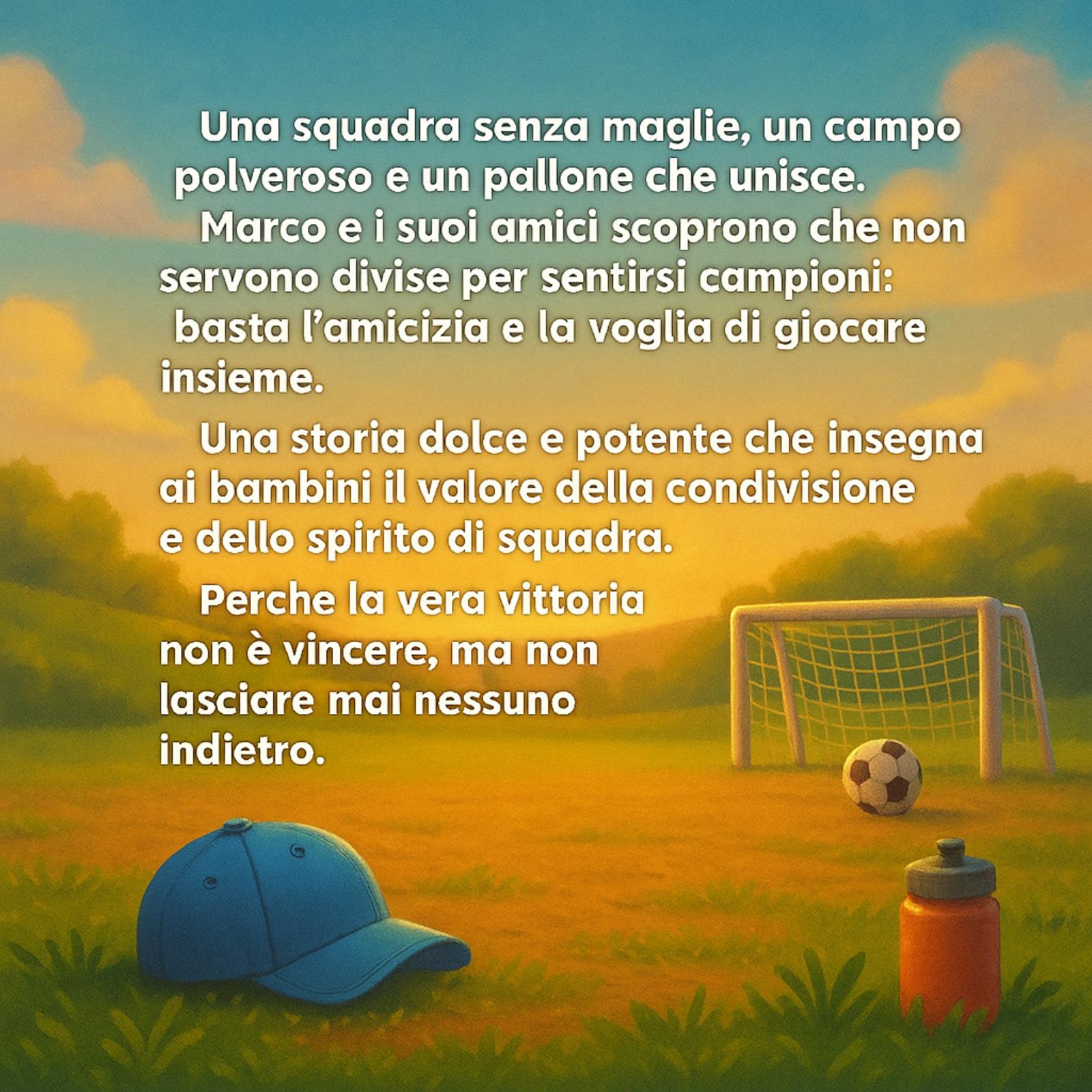 Acquista ora "Marco e la squadra senza maglie – La forza dell’amicizia" e regala ai tuoi piccoli una storia che insegna che la vera vittoria è essere uniti.
