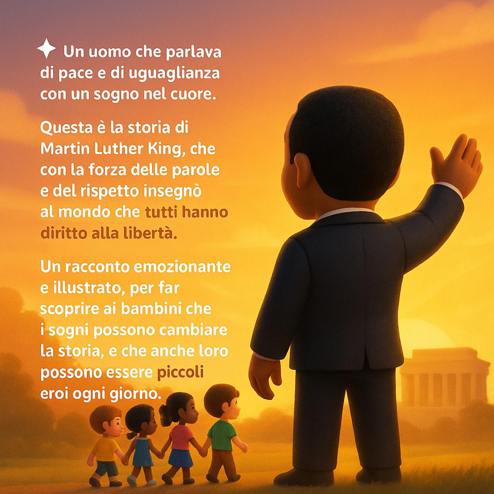 Il libro illustrato perfetto per bambini che amano le storie di coraggio, rispetto e uguaglianza. "Martin Luther King – La voce della libertà" è una favola moderna che racconta in modo semplice e coinvolgente la vita di Martin Luther King, l’uomo che con le sue parole e il suo sogno ha cambiato il mondo.