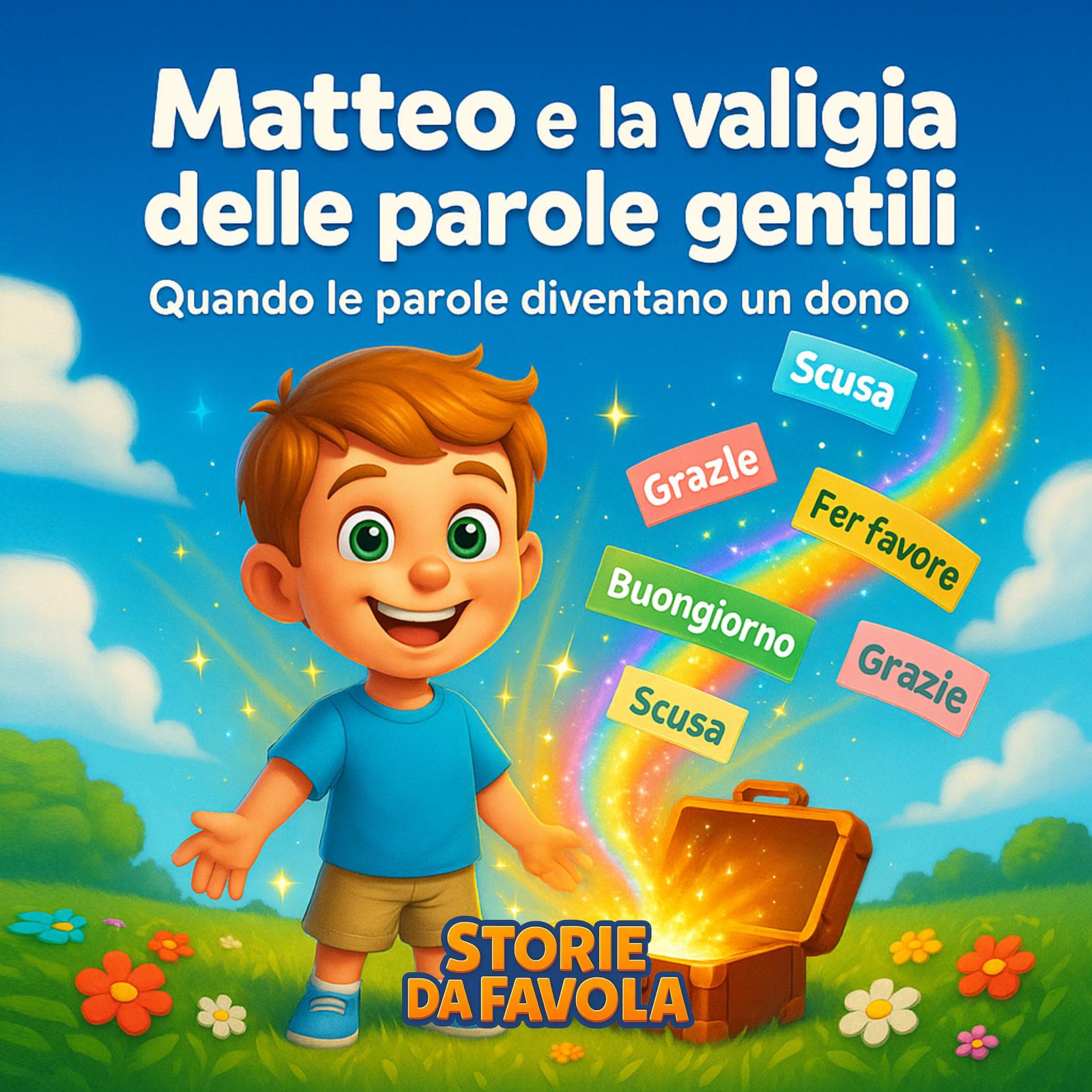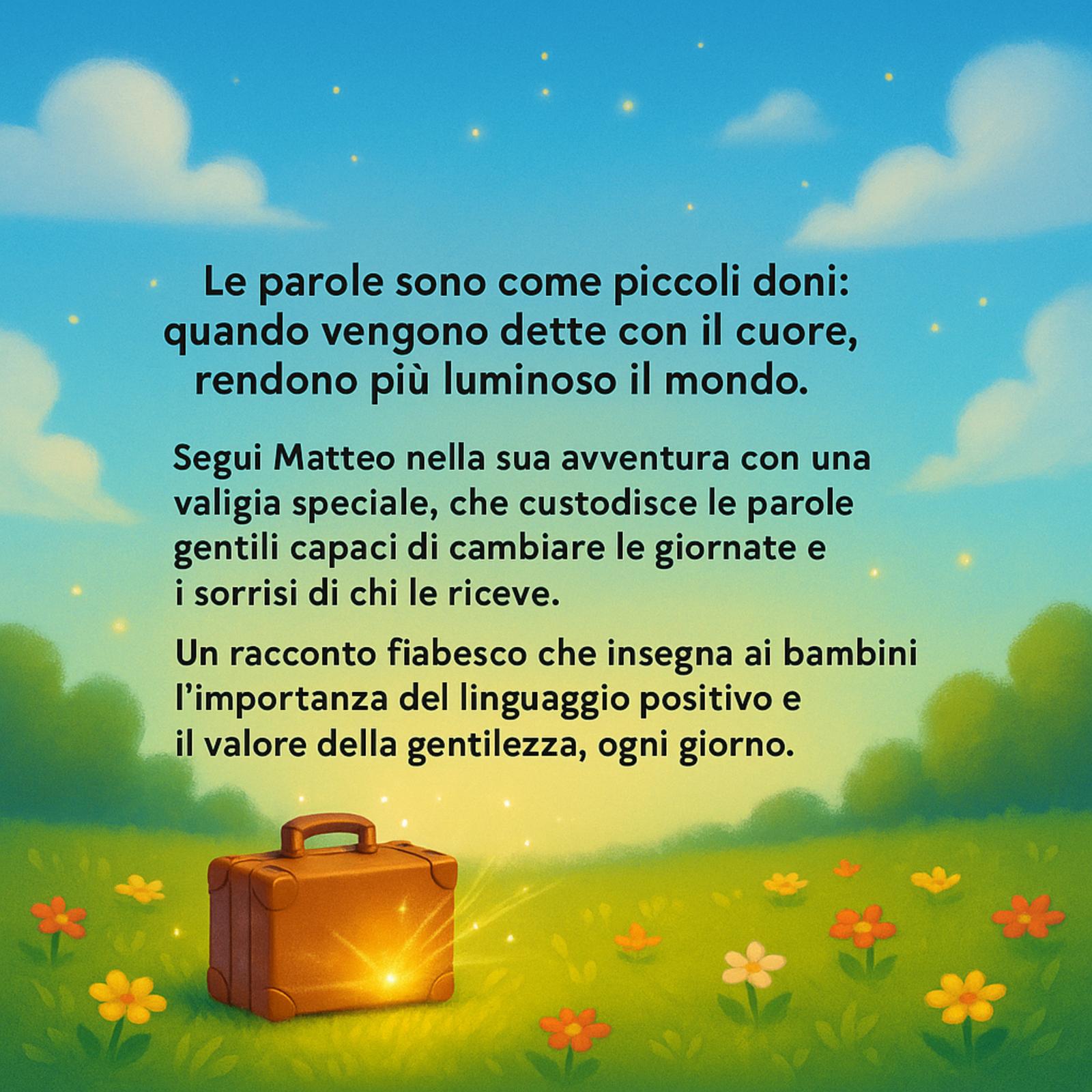 Matteo trova una valigia misteriosa piena di parole gentili che brillano. Le usa in famiglia e a scuola: saluta con “Buongiorno”, chiede “Per favore”, ringrazia con “Grazie”, risolve un litigio con “Scusa”, incoraggia con “Coraggio”, sorprende la maestra con “Complimenti” e accoglie un nuovo compagno con “Benvenuto”. Alla fine scopre che la vera magia non è nella valigia, ma dentro di lui.