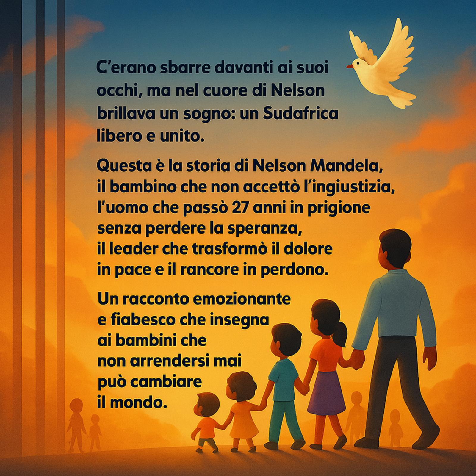 Il libro illustrato perfetto per bambini che amano le storie di coraggio, libertà e speranza. "Nelson Mandela – Il prigioniero che diventò Presidente" racconta in chiave fiabesca e coinvolgente la vita straordinaria di Nelson Mandela, l’uomo che con la sua determinazione ha cambiato il destino del Sudafrica e ispirato il mondo intero.