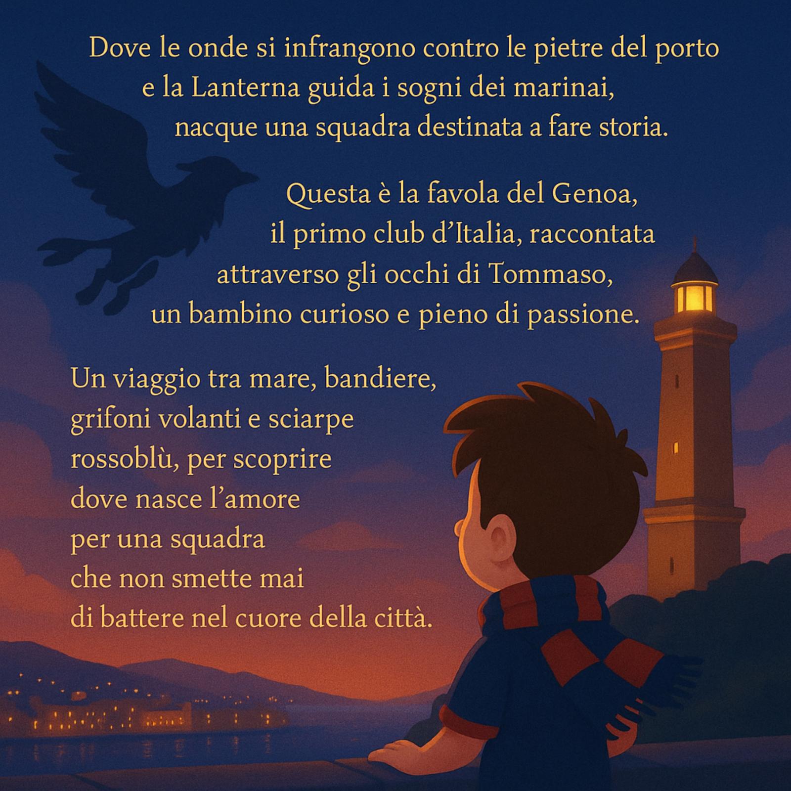In questo emozionante racconto, il piccolo Tommaso e suo nonno Enrico ci accompagnano tra le strade di Genova, tra ricordi, sogni e momenti indimenticabili, per scoprire come è nato l’amore per i colori rossoblù. Una favola moderna che unisce grandi e piccoli attraverso memoria, identità e appartenenza.