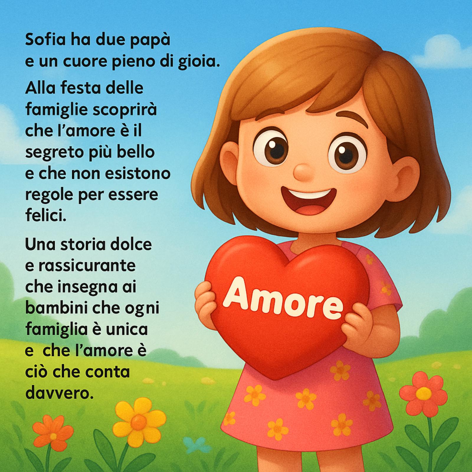 Sofia è una bambina solare che custodisce un piccolo segreto: ha due papà. A scuola, tra amici e compagni curiosi, troverà il coraggio di raccontarlo e di mostrare che la sua famiglia è speciale proprio come tutte le altre. Con l’aiuto della maestra, dei suoi genitori e del suo grande cuore, imparerà che ogni famiglia è unica e che l’amore non ha confini.